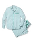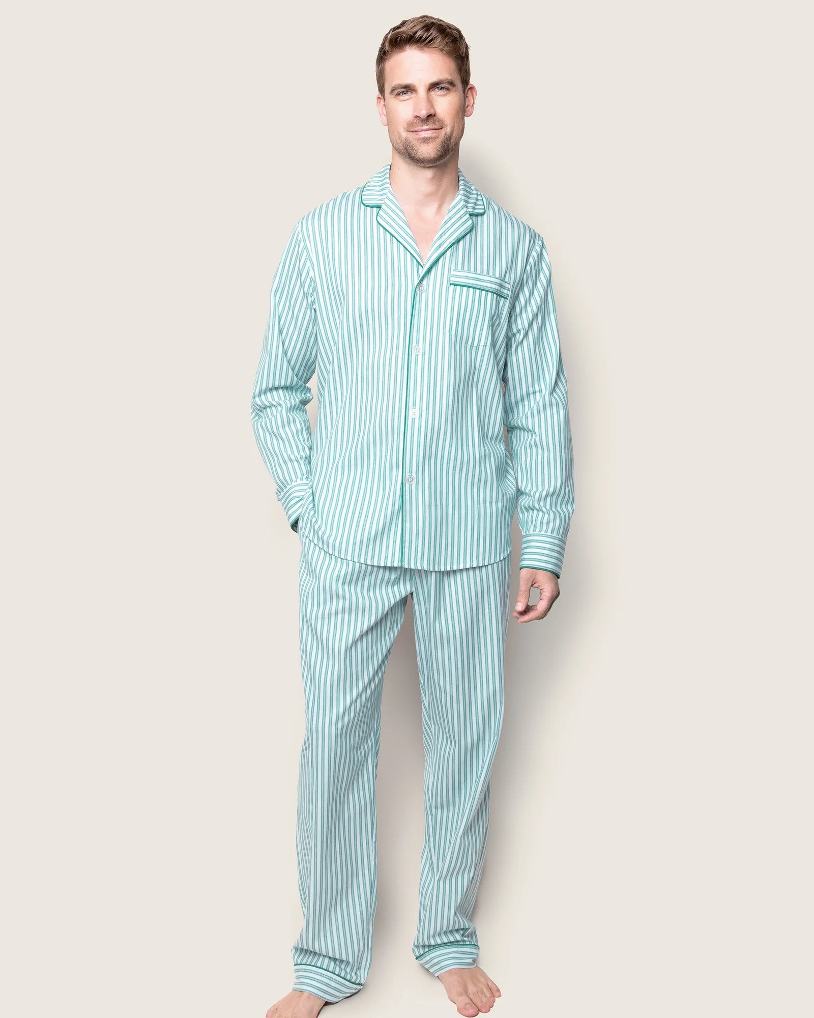 Our classic French ticking pattern takes on a new seasonal hue in a lush, deep green that channels the color of evergreen trees. The versatility of this print allows seamless transition from bedtime to holiday festivities in a snap. This classic twill pajama set is accented with green piping and finished with logo buttons.