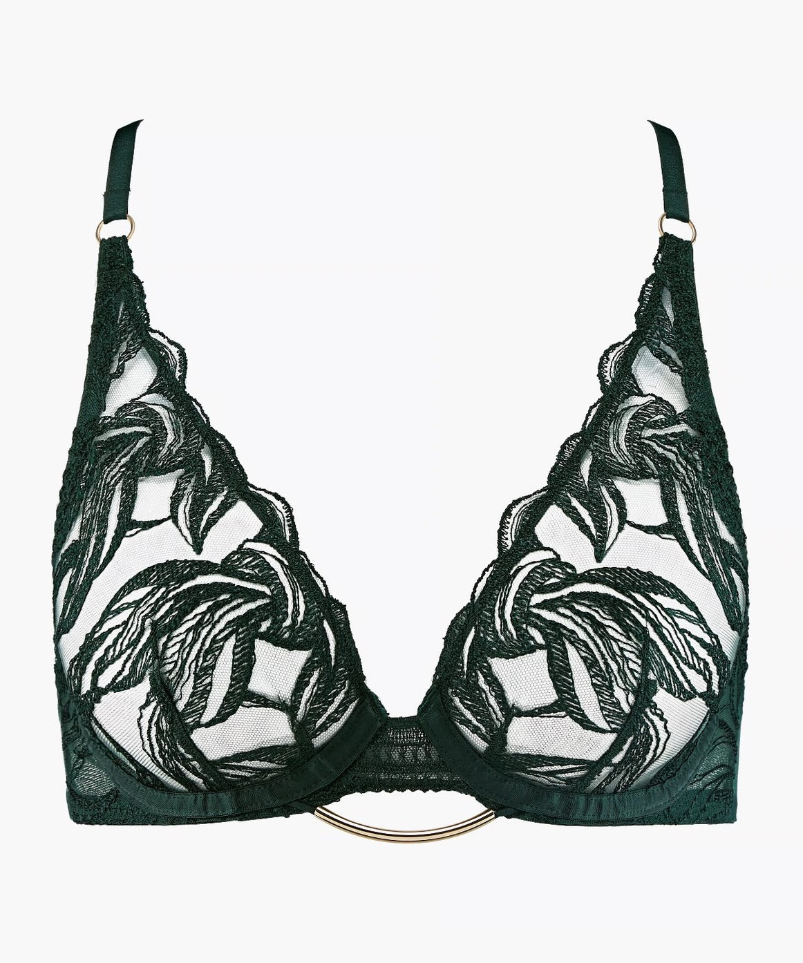Combining comfort with modernity, the Into The Groove underwired triangle bra gently shapes the bust. With a sexy neckline trimmed with embroidery and simple touches of gold on the straps and between the cups, as well as a completely see-through back, it creates an elegant and sensual look.