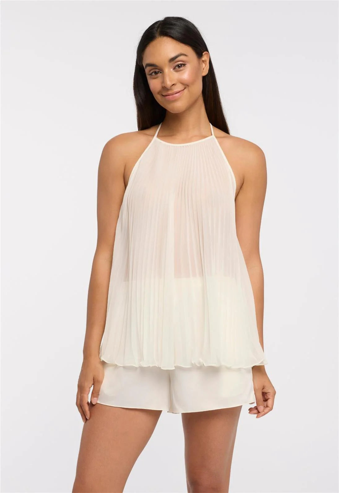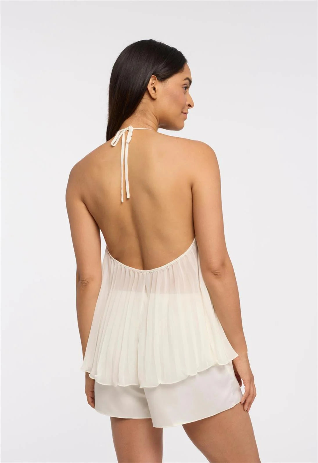 Daring for a little fun? Dare with the Malibu Cami Tap. This sheer halter top creates fluid motion with its sunburst pleating, and sensual open back. This chic ensemble will playfully be seen in and out of the bedroom.