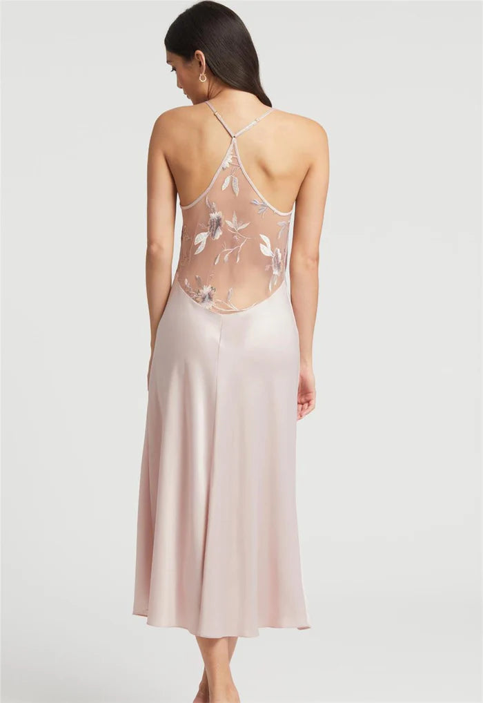 Rejoice in the ornate beauty of the Stunning Gown. This lustrous poly-charmeuse gown features adjustable straps and an immaculately adorned back panel of embroidered lace on sheer netting.